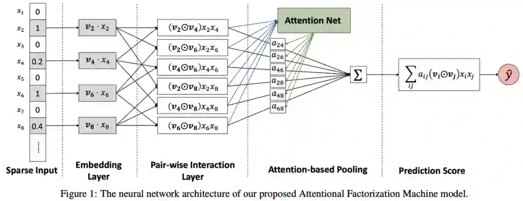 与NFM类似,AFM首先利用FM解决稀疏特征问题及浅层交互特征,同时利用深度注意力网络获取深层交互特征。模型的核心是注意力层(Attention-based Pooling Layer)通过关注不同的交叉特征和目标之间的关系,得到不同程度的贡献分数,然后加权求和通。同时利用MLP进一步处理训练数据中未出现样本的的评估问题,从而达到泛化模型的目的。