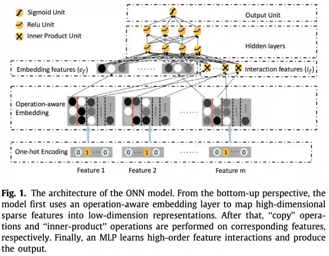 目前大多数模型对于一个特征在进行不同的操作时都使用相同的表示。但对于不同的操作,一个特征的最好的表示不总是相同的。ONN解决该问题的一个思路是在基本的通用的Embedding+MLP结构下,将PNN与FFM结合起来,实现了在embedding层的每一个特征对于不同操作(内积或者外积)有不同的表示,这对于之后进入MLP学习高阶特征交互时有更好的帮助。与PNN相比,ONN实现了operation-aware的embedding layer,即一个特征有多种embedding,对于不同操作可以选择不同的特征表示。和FFM模型最大的区别在于ONN加入了MLP,深度神经网络能够更好的挖掘特征深层次的依赖,学习到复杂的特征交互关系。