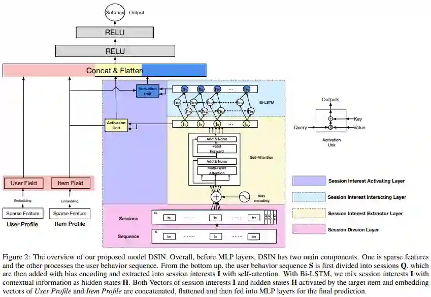 DSIN通过将用户的历史点击行为划分为不同session,然后利用Transformer对每个Session进行学习得到兴趣向量后,使用BiLSTM学习用户在多个Session之间的兴趣变化,从而更好地完成CTR预估。Session Division Layer完成对用户历史点击行为的划分,得到多个Sessions;Session Interest Extractor Layer使用Bias Encoding的方式表征不同Session间的顺序,同时考虑到用户兴趣可能来自不同因素,利用多头注意力机制对每个session 建模得到兴趣向量表示;Session Interest Interacting Layer在得到用户的兴趣向量表征之后,利用Bi-LSTM学习不同Session之间的由顺序带来的兴趣变化;Session Interest Activating Layer利用注意力机制学习不同Session和Item之间的相关性,混合上下文信息的兴趣信息之后,对距离较近的Session赋予更大的权重。