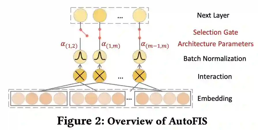 AutoFIS的目标是自动识别出有效的特征交互组合,避免引入噪声特征交互。模型整体分为两个阶段:搜索阶段(检测有效特征交互)和重训练阶段(去除冗余的特征交互,并重新训练模型)。模型会为每个特征交互引入门控单元来控制是否选择它。搜索阶段门控打开,正常学习每个特征交互的权重;重训练阶段,关闭不重要特征交互的门控,即在训练时丢掉这个特征交互。