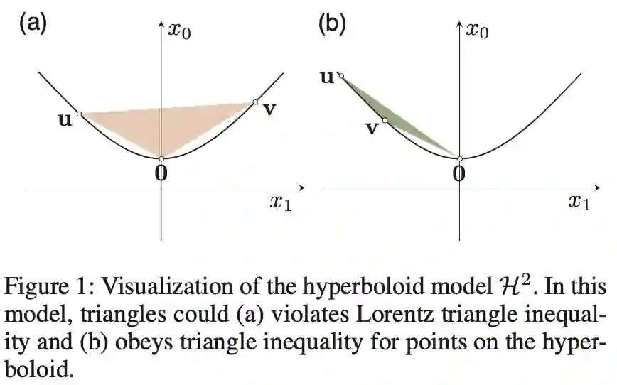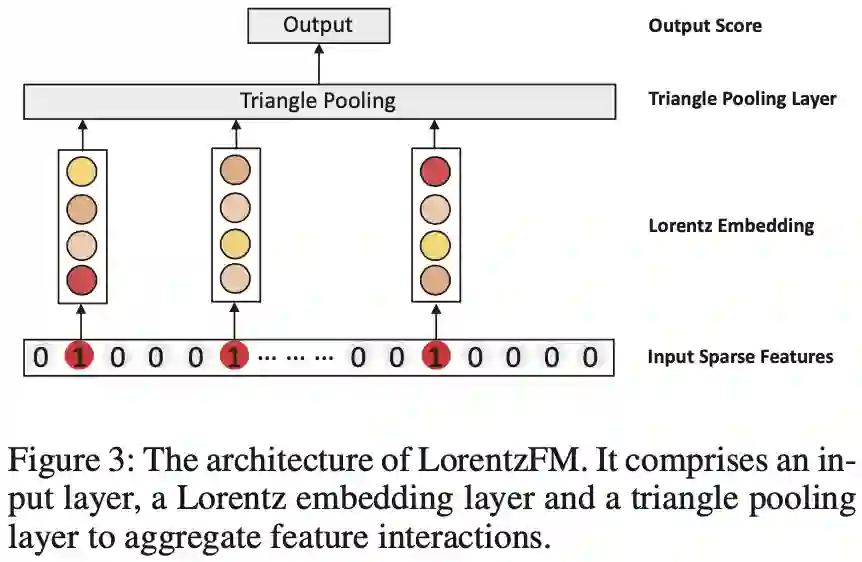 洛伦兹因子分解机模型没有使用深度模型的结构,但可以达到深度模型的准确率,而且降低了深度模型的参数量和训练时间。具体来讲,LorentzFM建模特征交互时,利用了双曲空间中两个特征之间距离是否违背三角不等式来构造特征交互,同时双曲三角形特殊的几何特性可以替换掉现在普遍使用的MLP层,达到了减少参数量的目标。