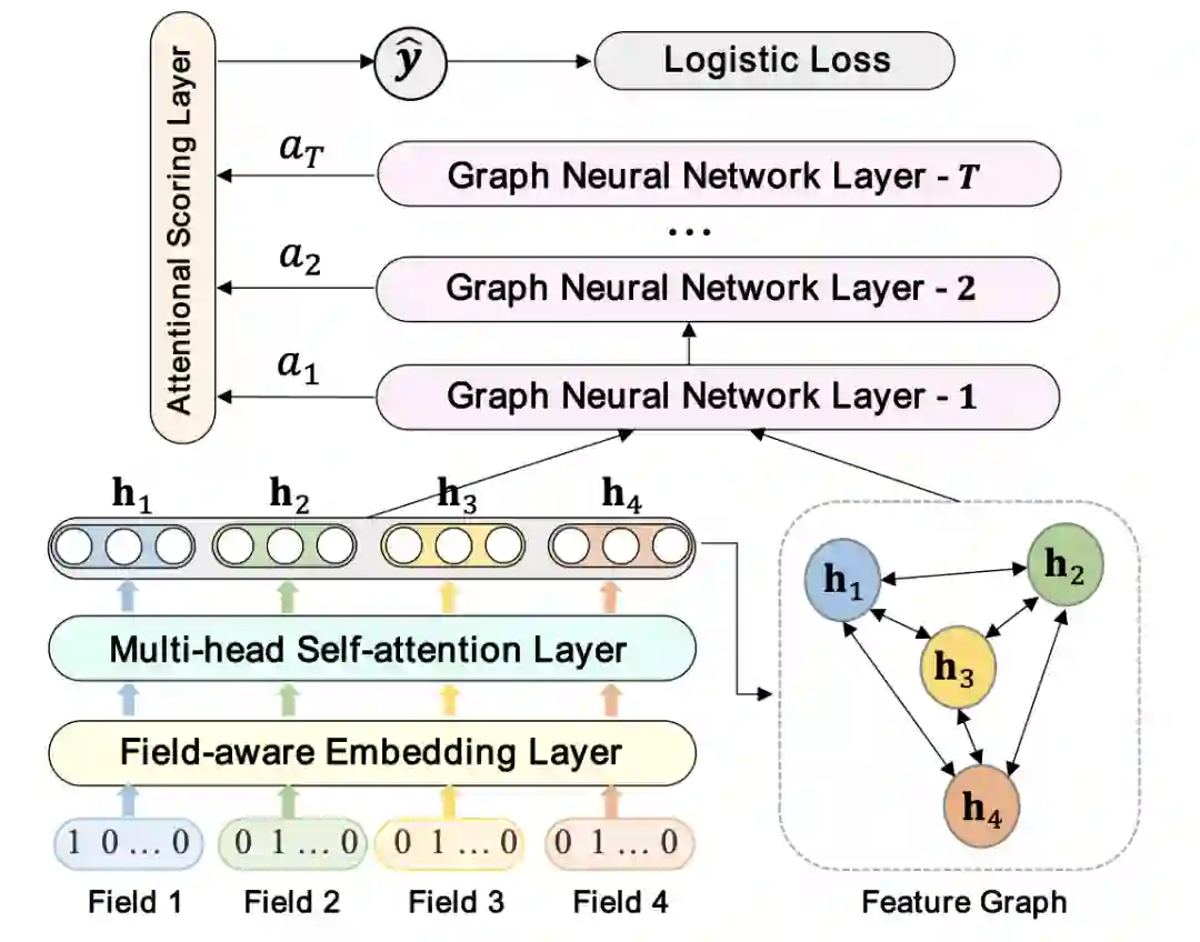 Fi-GNN首次尝试将GNN用于建模特征之间的复杂交互,属于开创性的工作。基本思想是构建特征图,将特征作为图的节点,两两节点之间都存在一条边,边上的权重代表特征交互的重要程度,以此将特征之间的复杂交互转化为特征图的节点之间的交互。在Embedding层中,模型使用了多头注意力网络层得到新的field embedding,蕴含了该field和其它特征field的高阶特征交互。输出为一个特征图,作为后面Fi-GNN模型的输入。Fi-GNN由多步组成。每一步会对节点做更新:使用注意力网络聚合邻居节点的信息,然后使用一个GRU单元对节点N进行状态更新。在Fi-GNN中,每个节点通过和邻居节点交换状态信息,以循环的方式更新自身的状态,图网络上更新的步数相当于特征交互的阶数。