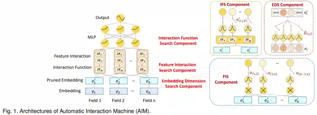 AIM是AutoFIS的扩展版,包含三个核心组件:特征交互搜索(FIS)、交互函数搜索(IFS)和嵌入维数搜索(EDS)。其中IFS以及FIS负责特征交互搜索,EDS负责特征表示搜索。FIS负责搜索特征交互的组合,可以看到FIS的结构与AutoFIS一致,但基本的FIS结构只能探索特征间的二阶交互,这里作者设计了 P 阶特征交互的搜索算法。IFS为每个特征交互组合设计了不同的运算选择,具体而言,本文设计了inner,outer与kernel product三种运算。在搜索阶段,IFS与FIS同时进行搜索,因为不同特征组合与组合间的运算是紧密联系的。特征交互搜索在自底向上的搜索过程中同时完成了特征组合搜索与特征组合间的运算搜索。EDS结构,它为特征embedding的每个值分配一个剪枝搜索权重,用来修改重参化后的embedding。最后根据搜索非0权重位置构建embedding table的稀疏表示。