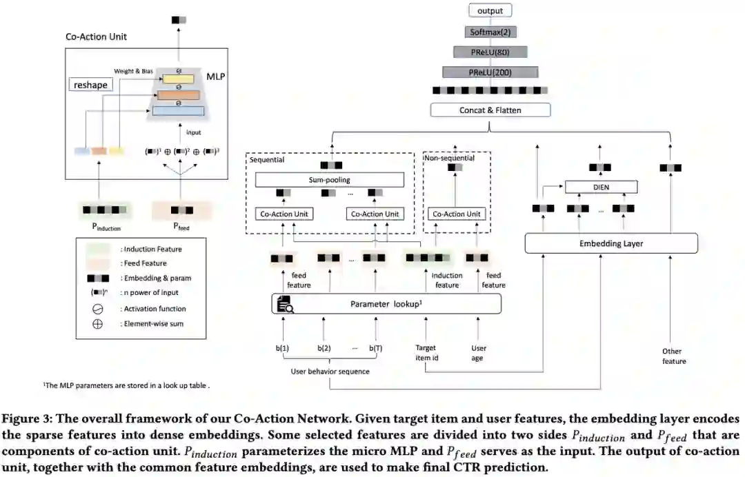 CAN主要以一种新的方式重新思考高阶特征交互。本文首先提出co-action的概念,指出特征交互对最终预测的影响。如果原始特征的co-action信息建模本身有用,那么笛卡尔积就是建模co-action最直接的方式。最直接的使用二维笛卡尔积的方式来显式做co-action建模会带让参数量急剧上升。为了解决这个问题,本文提出了Co-Action Unit使用模型化的方案建模特征之间的交互。具体来讲:Co-action Unit的输入包含两部分——希望建模交互关系的两个特征,一端信息作为输入,另一端信息作为MLP的参数,用MLP的输出来表达Co-action信息。