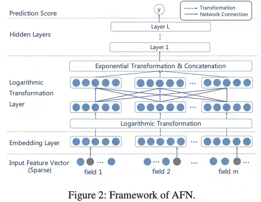 现有的特征交互的工作通常指定一个交互阶数,迭代出所有的交互特征,这样做一方面计算量很大,另一方面会引入噪声的特征组合。AFN本文借鉴了Logarithmic Neural Network (LNN)的思想,模型中的Logarithmic Transformation Layer可以自动学习保留出应该交互的特征以及应该进行几阶交互。其核心思想是引入对数mic变换,将特征对数化,再去做交叉运算。这样能将特征交互中每个特征的幂转换为带系数的乘法。