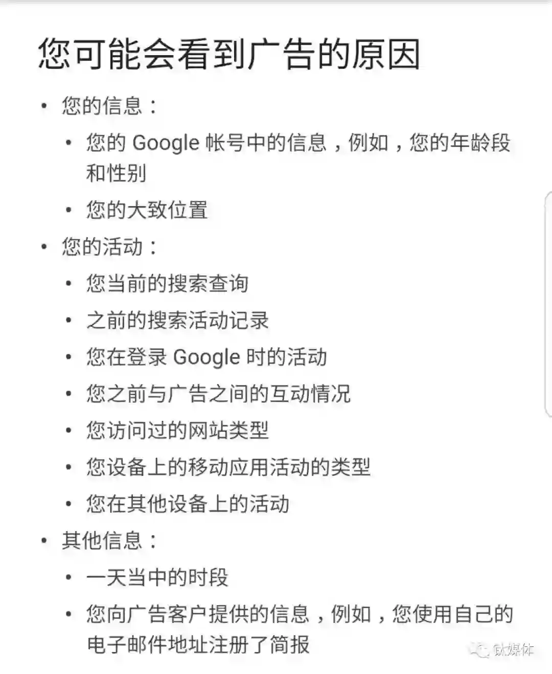 同样,广告和隐私之间也总是存在关系,谷歌也面临着如何妥善处理用户隐私的问题,当谷歌向你推送相关广告的时候,它总是会根据你之前相关信息和行为来进行匹配,甚至谷歌在其广告解释条文中明确地告知广告是根据哪些信息进行推送的,随着政府和公众对隐私问题重视程度越来越高,谷歌也面临着如何在精准广告和保证隐私这二者之间取得平衡。