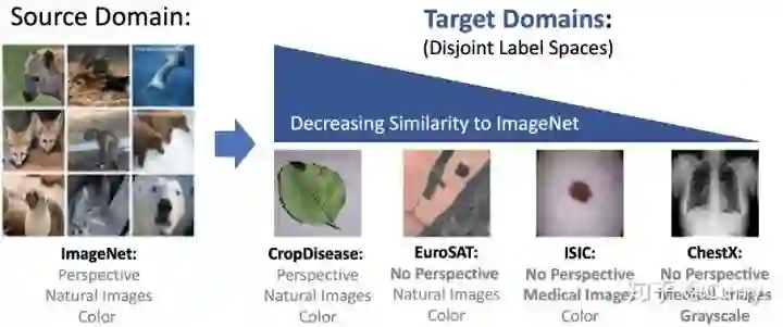 农业: CropDiseases2 彩色, 自然图像, 有自身的特点 (相似度 ⭐⭐⭐⭐) https://link.zhihu.com/?target=https%3A//www.tensorflow.org/datasets/catalog/plant_village 卫星图: EuroSAT3 彩色, 自然图像, 无透视变形 (相似度 ⭐⭐⭐) https://link.zhihu.com/?target=https%3A//www.tensorflow.org/datasets/catalog/eurosat 皮肤病: ISIC20184 彩色, 医学影像, 无透视变形 (相似度 ⭐⭐) https://link.zhihu.com/?target=https%3A//challenge2018.isic-archive.com/ X光片: ChextX5 灰度, 医学影像, 无透视变形 (相似度 ⭐) https://link.zhihu.com/?target=https%3A//nihcc.app.box.com/v/ChestXray-NIHCC