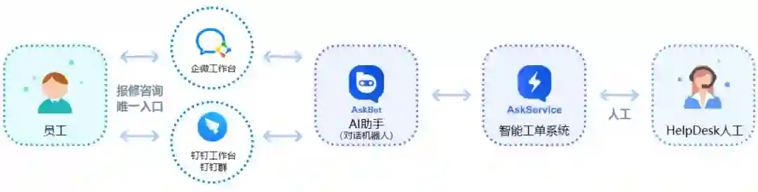 、飞书、企业微信、微信服务号、小程序、网页或企业App等任意入口上向AskBot描述需求,AskBot可智能识别需求类型,按照企业知识库预设和所对接的系统,随时随地自动回复解决方案或判断是否需要创建工单解决;员工亦可选择直接发起工单请求协助;此外,AskBot还支持依据工单类型智能确定优先级,自动化流转并解决。
