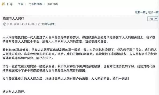 2018年11月,人人网被现在的多牛传媒收购,成为多牛旗下多元化媒体矩阵的一角。