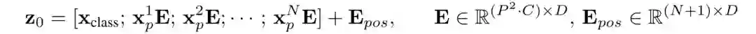 其中 即未Linear Projection后的patch embedding(都是 维),右乘 维的矩阵 表示Linear Projection,得到的 都是 维向量;这 个 维向量和同样是 维向量的 concat就得到了 维矩阵。加上 个 维position embedding拼成的 维矩阵 ,即得到了encoder的原始输入 。