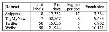 为了探索主题记忆网络对短文本分类的性能,本文选择了四个基准数据集,分别为:TagMyNews 新闻标题、Snippets 搜索片段、Twitter 和 Weibo(新浪微博),四个数据集的统计信息如表 2 所示。