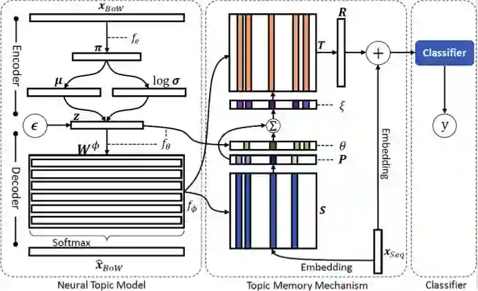 图 1:主题记忆网络的框架图。从左到右分别是神经主题模型、主题记忆机制与文本分类器。