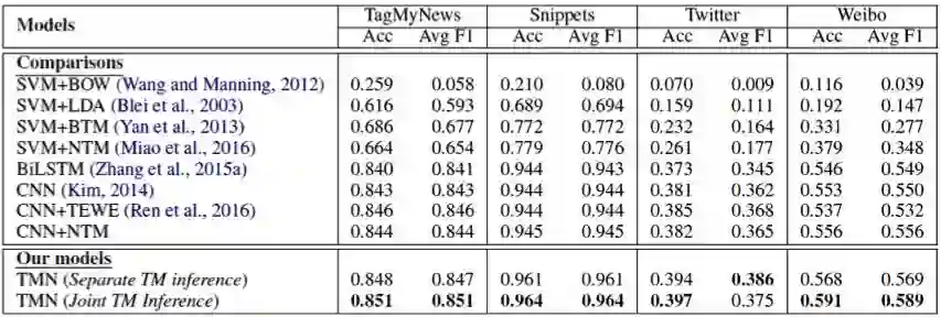 表 3:主题记忆网络与比较模型的实验结果。TMN 表示主题记忆网络:TMN (Separate TM inference) 表示先预训练好神经主题模型,之后把其输出的主题表示初始化主题记忆机制来进行文本分类。TMN (Joint TM inference) 表示神经主题模型与文本分类联合训练。两个版本的主题记忆网络的结果显著高于所有的比较模型(p<0.05 paired t-test)。