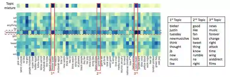 为了探索为什么主题记忆网络能取得更好的性能,本文讨论了主题记忆网络对表 1 的测试样例 S 学到了什么表示,结果如图 2 所示。由结果读者可以观察到,与 S 最相关的三个主题分别与 Bieber、追星以及音乐相关。虽然三个主题的相关主题词大多都不被包含于 S 当中,但是通过挖掘词与词的共现关系,主题模型成功扩展了 S 中主题词 wristband 的语义,从而使得 S 得以被正确分类到 New Music Live。