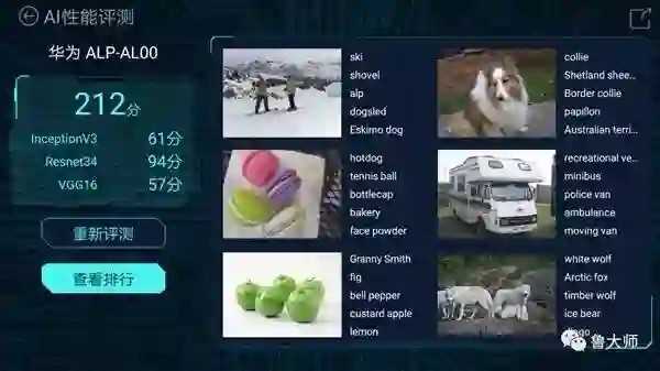 鲁大师AI性能评测使用目前较为常用的三种神经网络Inception V3、ResNet34、VGG16的特定算法,对机器给出的图片内容进行识别,按照概率高低输出可能的结果列表。