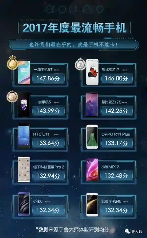 其他入围TOP10的还有:努比亚Z17、努比亚Z17S、360 Q5 Plus、锤子坚果Pro 2、一加5、vivo Xplay 6。