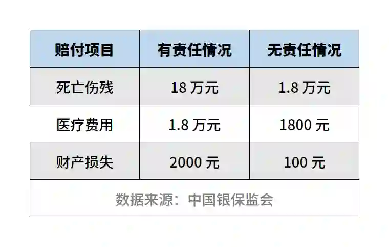 无责任情况下对应的限额分别为 1.8 万元、1800 元和 100 元。