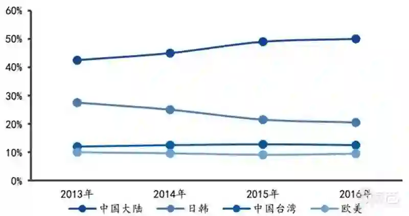 过去十年,液晶面板产能向韩国、中国台湾和大陆三地集中。尤其在产品价格不断下降,全球 TFT-LCD 显示面板需求增速放缓的背景下,国内液晶面板产业受益于产能转移发展速度高于全球水平。