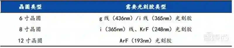 ▲不同尺寸晶圆制造中主要的光刻胶类型