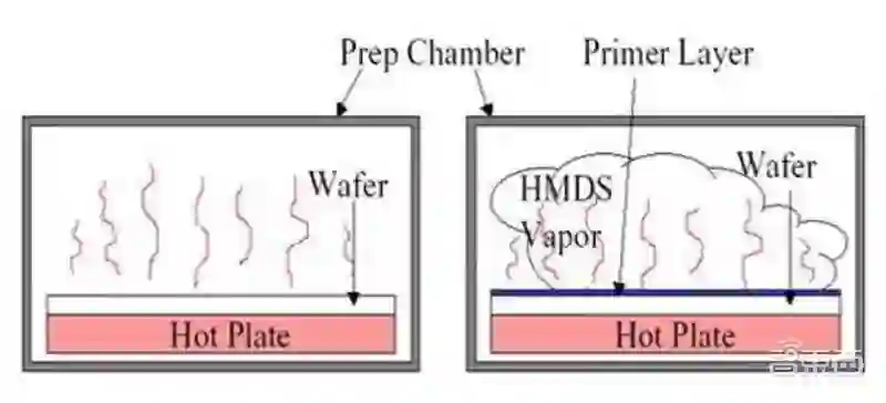 接下来是预烘和底胶涂覆工艺,光刻胶中含有溶剂,硅片脱水烘焙能去除圆片表面的潮气、增强光刻胶与表面的黏附性,这是与底胶涂覆合并进行的,底胶涂覆增强光刻胶(PR)和圆片表面的黏附性。广泛使用 (HMDS)六甲基二硅胺、在 PR 旋转涂覆前 HMDS 蒸气涂覆、 PR 涂覆前用冷却板冷却圆片。