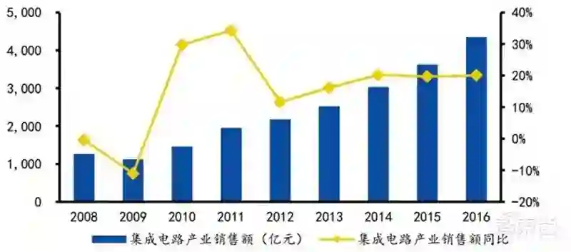 凭借着巨大的市场容量和消费群体,中国已成为全球最大的半导体消费国。 2000-2016 年,中国半导体市场增速领跑全球, 年均复合增速达到 21.4%,其中全球半导体年均增速是 3.6%,美国将近 5%,欧洲和日本都较低。
