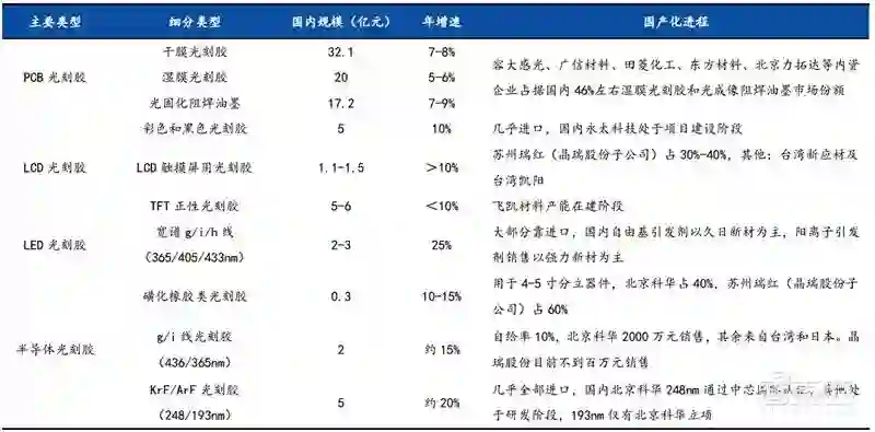 整体来说, PCB 产业对光刻胶的技术要求较低, PCB 光刻胶在光刻胶产品系列中属于较低端,目前国产化率已达到 50%,并有望进一步扩大, PCB 产业的稳定增长,促进了国产光刻胶市场的进一步扩大。