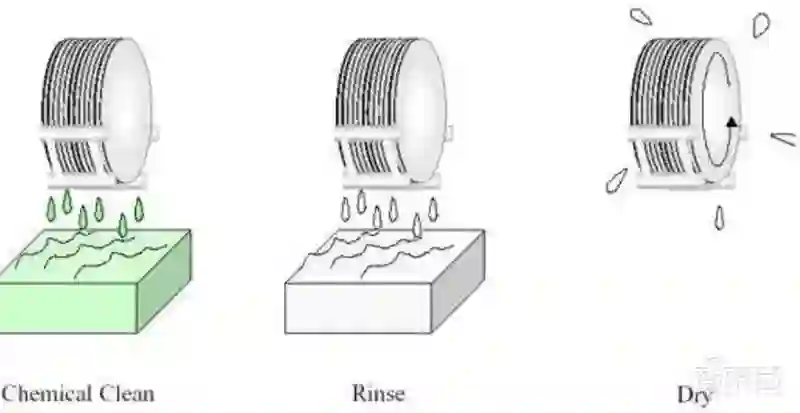 光刻工艺之前先要进行硅片清洗,目的是去除污染物,去除颗粒,减少针孔和其他缺陷,提高光刻胶粘附性。基本步骤为化学清洗、漂洗、烘干。