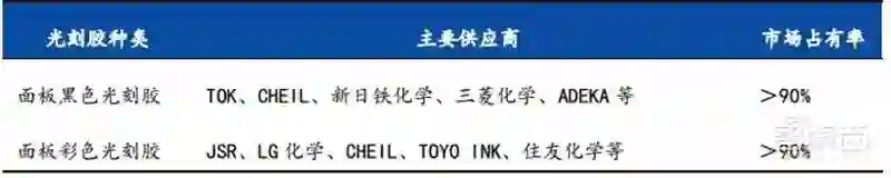 面板光刻胶技术壁垒较高, 日韩企业占据极大市场份额, 如 JSR、住友化学、三菱化学等公司, 市占率超过 90%。