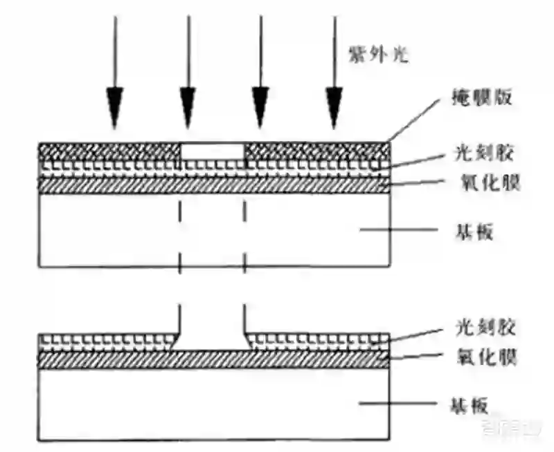 集成电路光刻工艺是指利用曝光和显影在光刻胶层上刻画几何图形结构,然后通过刻蚀工艺将光掩模上的图形转移到所在衬底(硅晶圆)上。基本原理是利用光刻胶感光后因光化学反应而形成耐蚀性的特点,将掩模板上的图形刻制到被加工表面上。