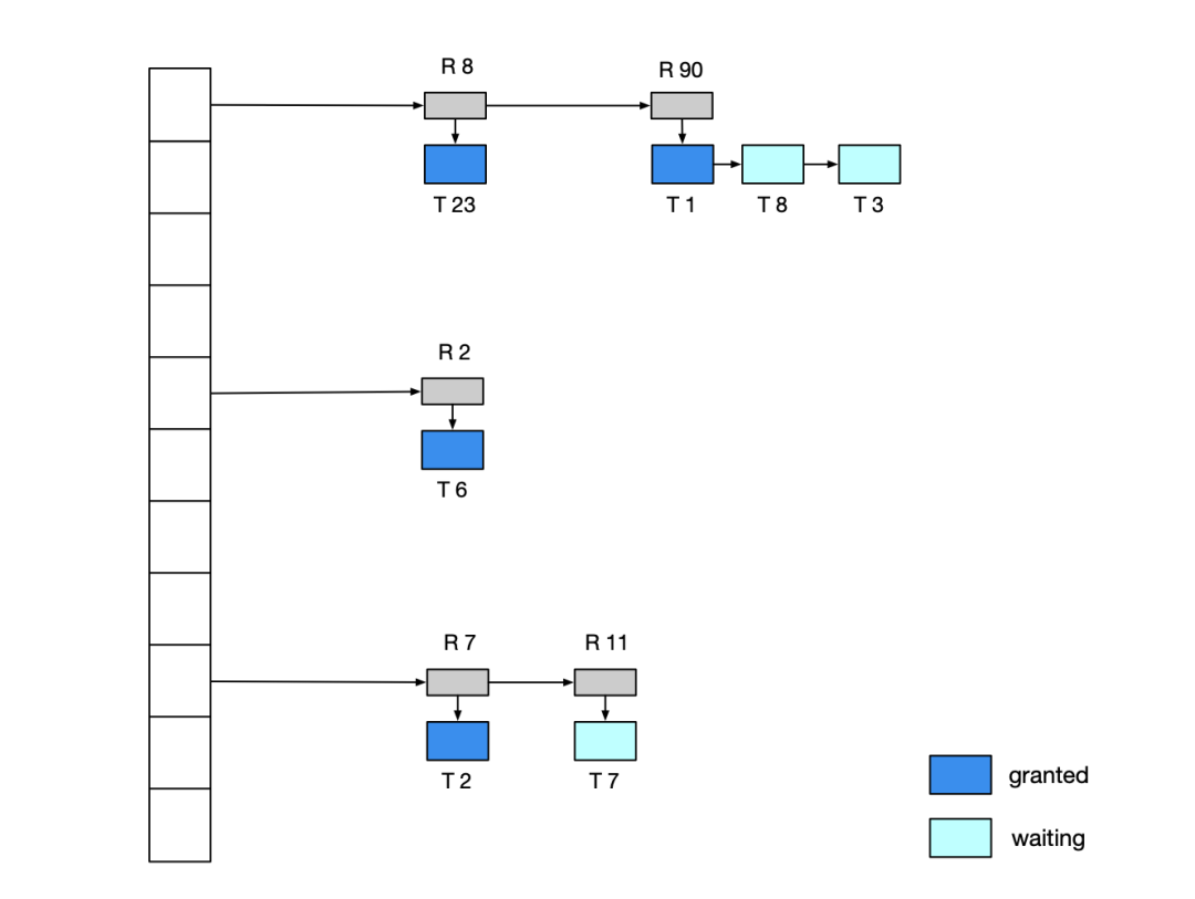 完全的 Redis 接口兼容性对 Tair 来说是至关重要的,这里简单介绍下 Tair 采用的轻量锁方案。一般情况下,处理 KV 引擎的事务并发只要保证在 key 级别上串行即可,轻量锁方案都是实现一个 Hash Lock Table,然后对一个事务中所有涉及到 key 进行加锁即可。这个 Hash Lock Table 类似这样: