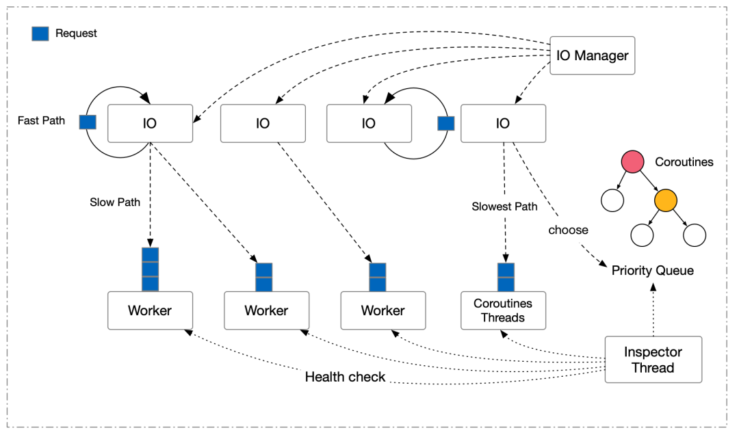 请求被分为 Fast Path,Slow Path 以及可能造成严重阻塞的 Slowest Path 三类。Fast Path 直接在 IO 线程上执行并返回,Slow Path 在单独的 Worker 线程上计算(最后回到 IO 线程上回包),Slowest Path 是引擎的代码估算系统得出的慢速请求,会被投递给专门的 Coroutines Threads 处理。这里重点介绍下 Coroutines Threads,本质上这是一组协程和线程以 M:N 模型进行协作的抽象,每个慢速请求会创建一个新的协程加入到优先队列里被调度执行。使用协程切换的目的是希望慢查询本身也是有优先级的,次慢的查询理应比更慢的查询尽早返回,而不是简单的 FCFS(First Come First Serve)策略。