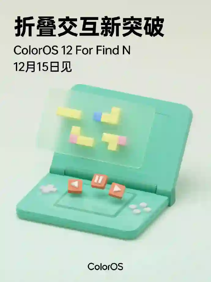 OPPO 今日官方宣布, OPPO Find N 折叠屏手机将搭载特殊版本的系统:ColorOS 12 for OPPO Find N。此次特殊版本将专门针对折叠屏手机的交互进行优化,号称“折叠交互新突破”。细节方面官方并未透露具体有哪些方面的优化,从海报的游戏机的素材内容不难猜测,其或许通过折叠特性加入了不少与游戏相关的交互方式,例如上屏显示游戏内容,下屏提供游戏虚拟按键。