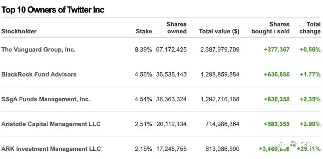 在马斯克入股之前,推特的最大股东为先锋领航投资公司,持股8.39%,其余股东的份额都不足5%。