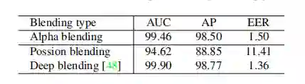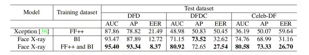 从最近发布的大规模数据集上测试,然后从AUC、AP和EER三个方面给出结果。如下图所示框架比基准的性能更好。如果使用其他的换脸图像,即使与测试集有不同的分布,性能也会有所提高。