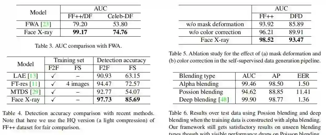 在测试部分评估了Face X-Ray使用四个数据集的泛化能力。这四个数据集包括:Face Forensics++、Deepfakedetection、Deepfake Detection Challenge、celeb-DF。