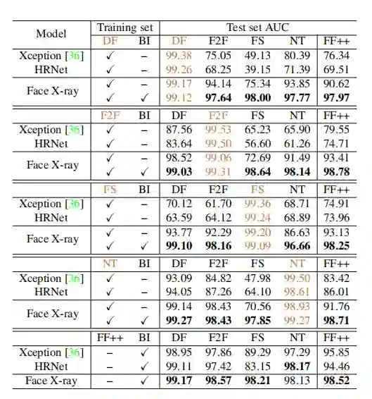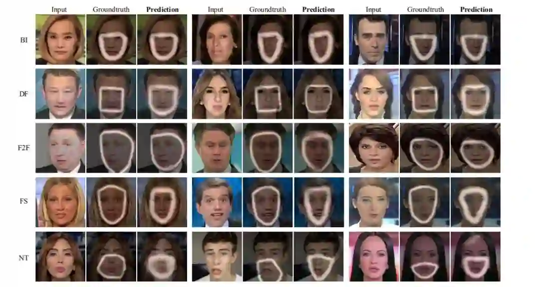 在实验部分,研究人员在Face Forensics++和另一个包含由真实图像构建的混合图像的训练数据集上训练了Face X-Ray,训练只采用数据库里的“真图”,不使用假图。其中,Face Forensics++是一个包含1000多个用四种最先进的面部操作方法操作的原始剪辑的大型视频语料库,包括DeepFake、Face2Face、Face Swap、NeuralTextures。