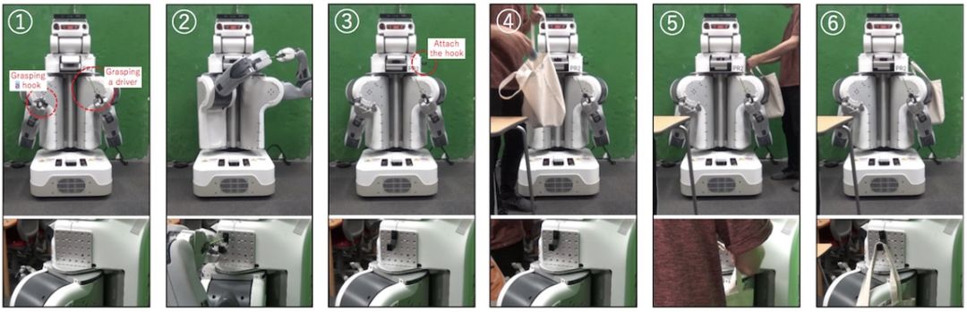 在一个实验中,研究人员教 PR2 机器人把挂钩钩在肩膀上。机器人一手拿着挂钩,另一只手握螺丝刀。挂钩安装好以后,研究人员将一个手提袋挂在钩上来测试操作结果。