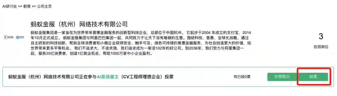 进入最佳雇主活动页面,选择你支持的企业,点击「投票」按钮,进入相关企业公司主页。