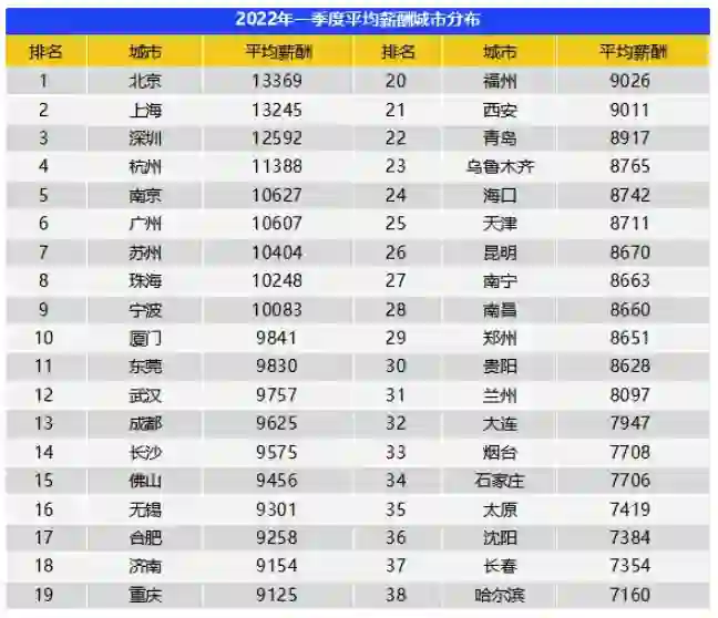 【一季度38个城市平均薪酬10014元】智联招聘发布了2022年第一季度《中国企业招聘薪酬报告》。数据显示,一季度全国38个核心城市平均薪酬为10014元/月。其中北京(13369元/月)、上海(13245元/月)、深圳(12592元/月)和杭州(11388元/月)四地的月薪处于领先地位。