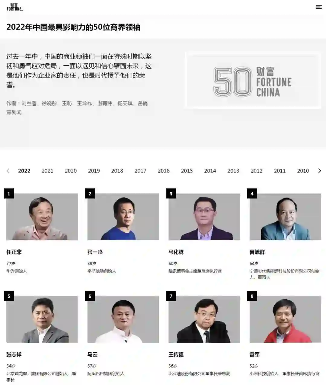 财富中文网发布2022中国最具影响力50位商界领袖榜单,华为创始人任正非、字节跳动创始人兼全球首席执行官张一鸣、腾讯董事会主席兼首席执行官马化腾分列前三。马云从2020年的榜首已逐步下滑至2022年的第六。(中新经纬)