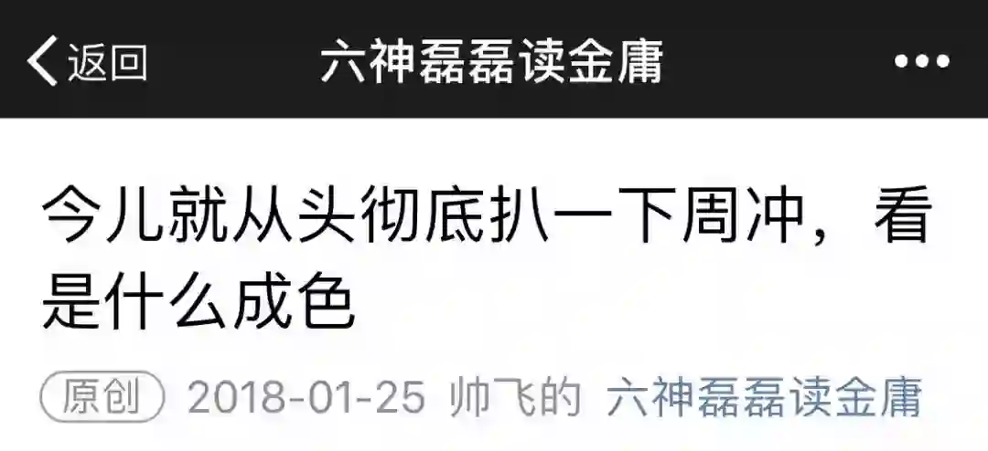 1月23日,六神磊磊发文《这个事我忍了很久了,今天一定要说一下子》,直指多个自媒体大号洗稿,其中包括“周冲的影像声色”,其公号上刊发的《郭襄与张三丰:你的风陵渡,我的铁罗汉》“洗”了自己旧作。