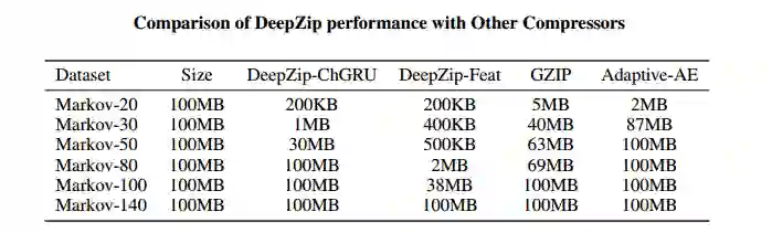 图 7:包含 128 个单元的 DeepZip 模型与 GZIP[15]、适应性算术编码-CABAC 的表现对比