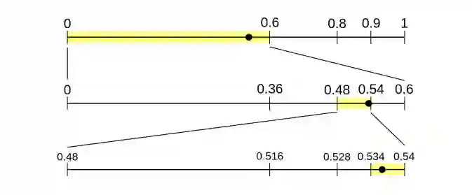 算术编码器保持在区间 [0,1] 之间。每个符号流唯一地确定一个范围,这个范围可按顺序计算,并直接基于下一符号的概率评估。它可视为传递至下一迭代的算术编码器的一个状态。最后,该范围被编码,由此形成了压缩数据。在给定概率评估的情况下,解码操作则相反。算术编码操作如图 2 所示。