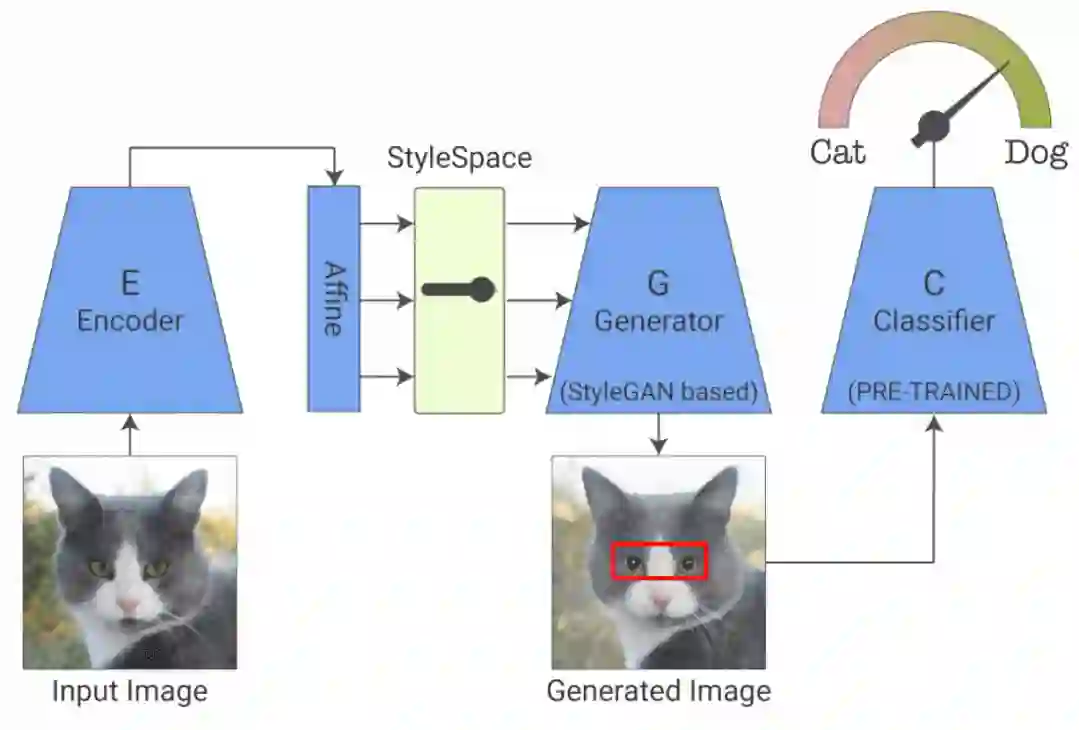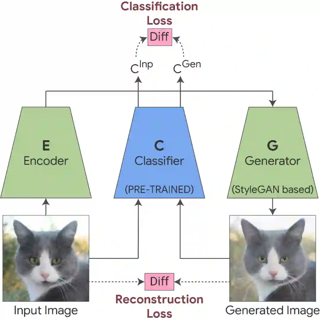 StylEx 通过使用两个附加组件训练 StyleGAN 生成器来实现。第一个是编码器,它与具有 reconstruction-loss 的 GAN 一起训练,并强制生成的输出图像在视觉上与输入相似,从而允许生成器应用于任何给定的输入图像。然而,仅仅只有图像的视觉相似性是不够的,因为它可能不一定捕获对特定分类器(例如医学病理学)重要的细微视觉细节。