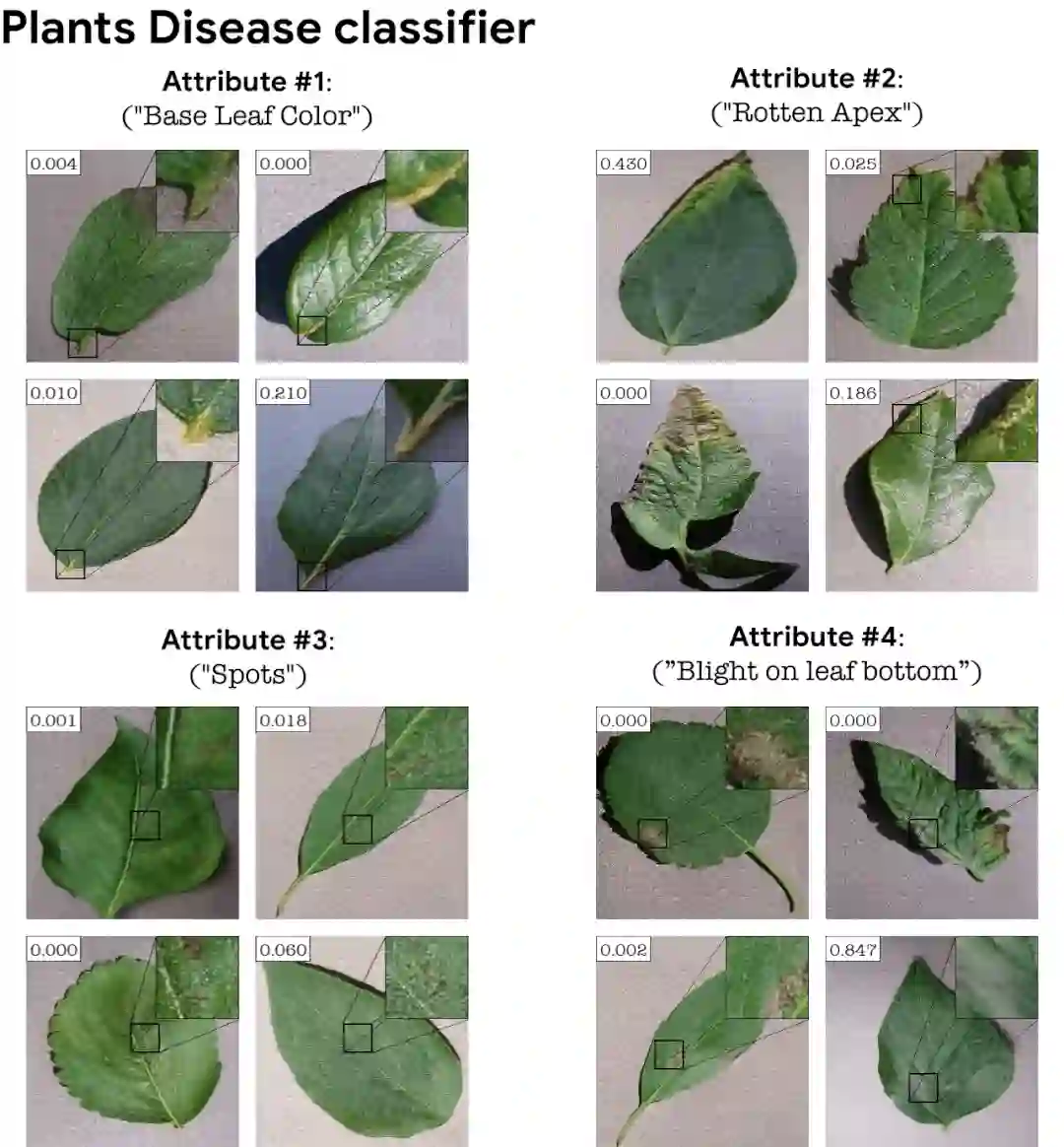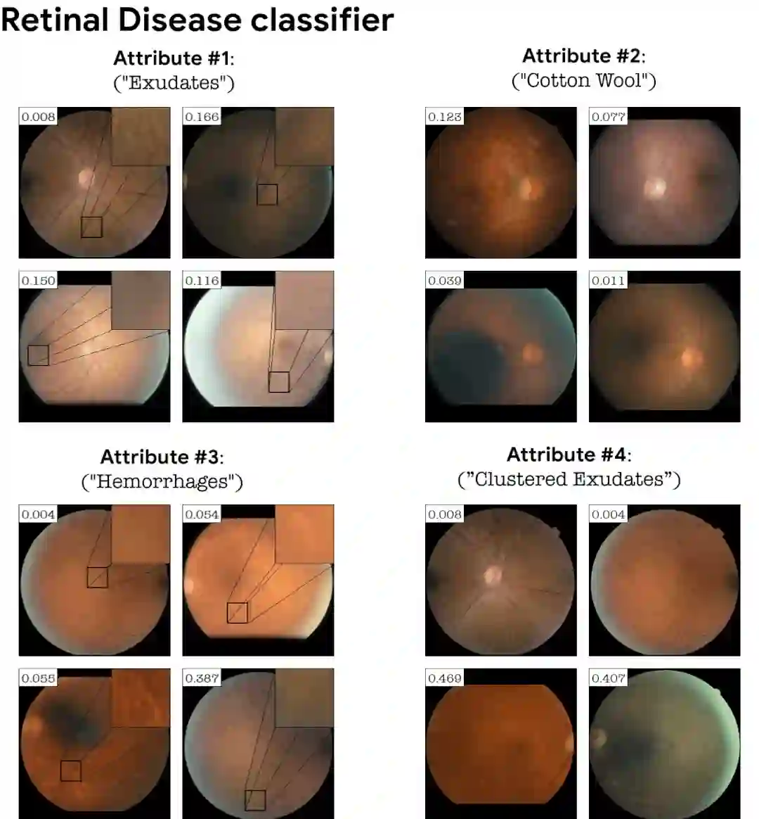 对于分类严重依赖精细细节的任务,将 classifier loss 添加到 StyleGAN 训练中至关重要。举例来说,在没有 classifier loss 的情况下,在视网膜图像上训练的 GAN 不一定会产生与特定疾病对应的精细病理细节。而添加 classification loss 使得 GAN 生成这些微妙的病理,作为分类器的解释。下面以视网膜图像分类器(DME 疾病)和不健康 / 健康树叶分类器为例。StylEx 能够发现与疾病指标一致的属性,例如视网膜的「硬渗出物」。