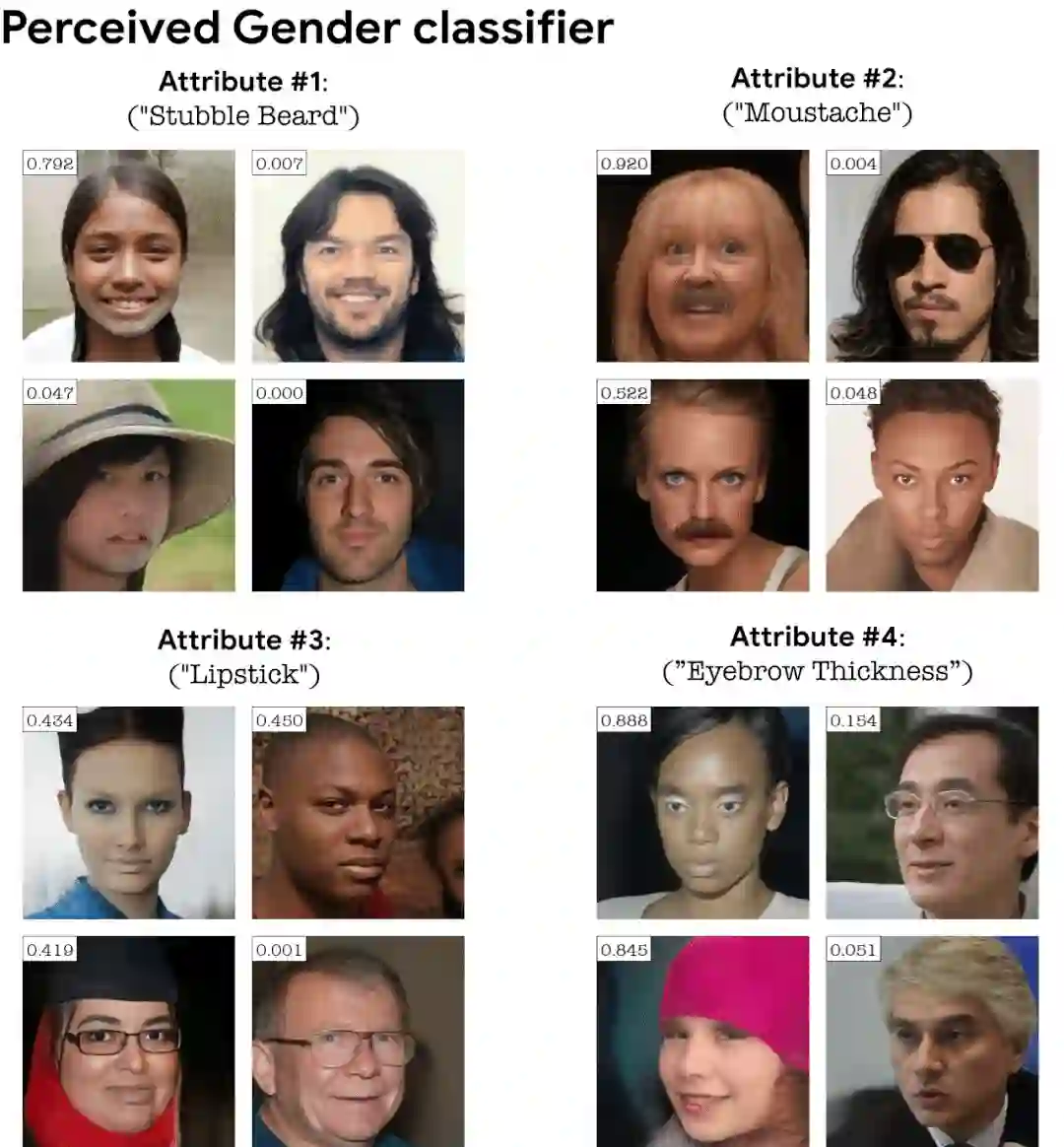 对于性别分类器,以下是每个分类器检测到的前四个属性。对于每个属性,该研究在源图像和属性操作图像之间进行变换。属性(例如胡子、眉毛等)对分类器概率的影响程度显示在每个图像的左上角。