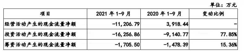 再次是呈现负数的现金流净额。2021年1至9月,德尔玛经营活动产生的现金流量净额净流出1.12亿元。招股书给出的原因是因为存货规模扩大,支付较多供应商货款。同期,投资活动产生的现金流量净额为-1.63亿元,上一年同期为-0.91亿元,主要由于支付土地购置款所致。
