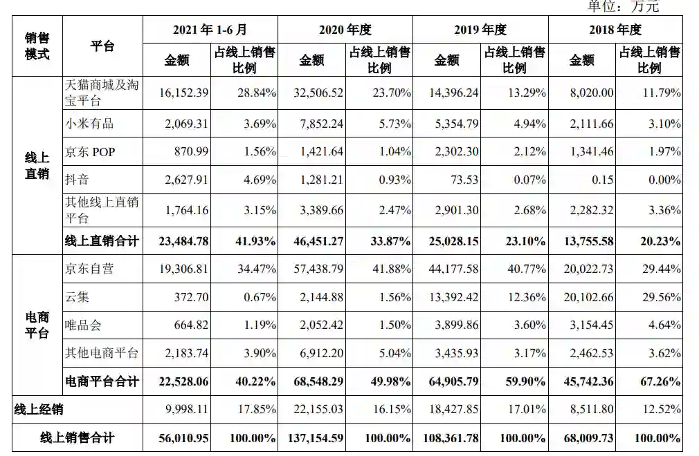 有意思的是,尽管在直播带货上投入了较大成本,但德尔玛的线上收入却呈现逐年下降趋势。根据招股书显示,从2018年到2021年上半年,其线上收入分别占比为70.56%、71.58%、61.68%和 45.03%。