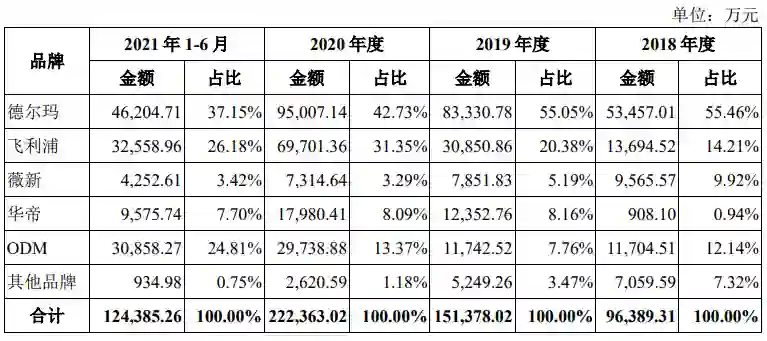 那么,离开了飞利浦加持的德尔玛将会如何?一个明显数据是,从2018年到2021年上半年,飞利浦带来的销售收入分别为1.37亿元、3.09亿元、6.97亿元和3.26亿元,占营收比为14.21%、20.38%、 31.35%和 26.18%。