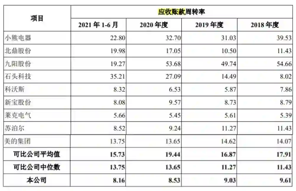 在2021年上半年,以小熊电器、北鼎股份、九阳电器为例,应收账款周转率(应收账款转化为现金的平均次数)则分别为22.8、19.98、19.27,是德尔玛的近3倍。因此,对于极为强势的小米,德尔玛议价能力显然并不强。